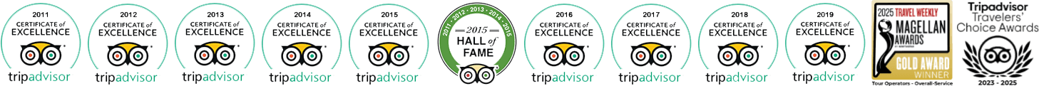 TripAdvisor only issued the coveted Hall of Fame for consecutive years of excellence in 2015. However, Culture Discovery Vacations received the Certificate of Excellence for 9 consecutive years, every year they awarded it. Then we continued with their updated "Traveler's Choice" award, and in 2025 we we awarded the travel version of an Oscar: The Magellan Gold Award for best service. We have no way of knowing how small the pool of companies that can say this are, but we are pretty happy with it!